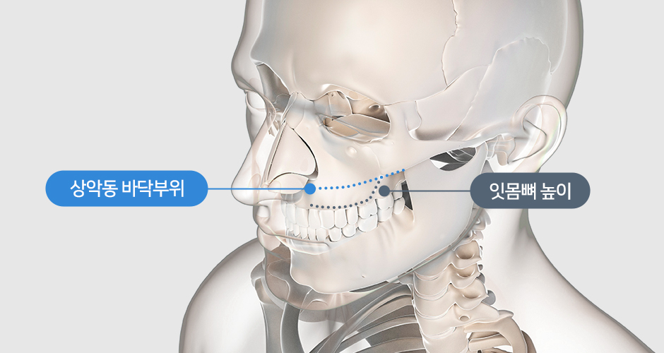 얇은 턱뼈 위에 코와 광대 사이 빈 공간으로 뼈 이식술을 동반해 임플란트를 식립합니다.