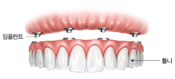 틀니 형태의 보철물을 임플란트에 고정시키는 방법으로